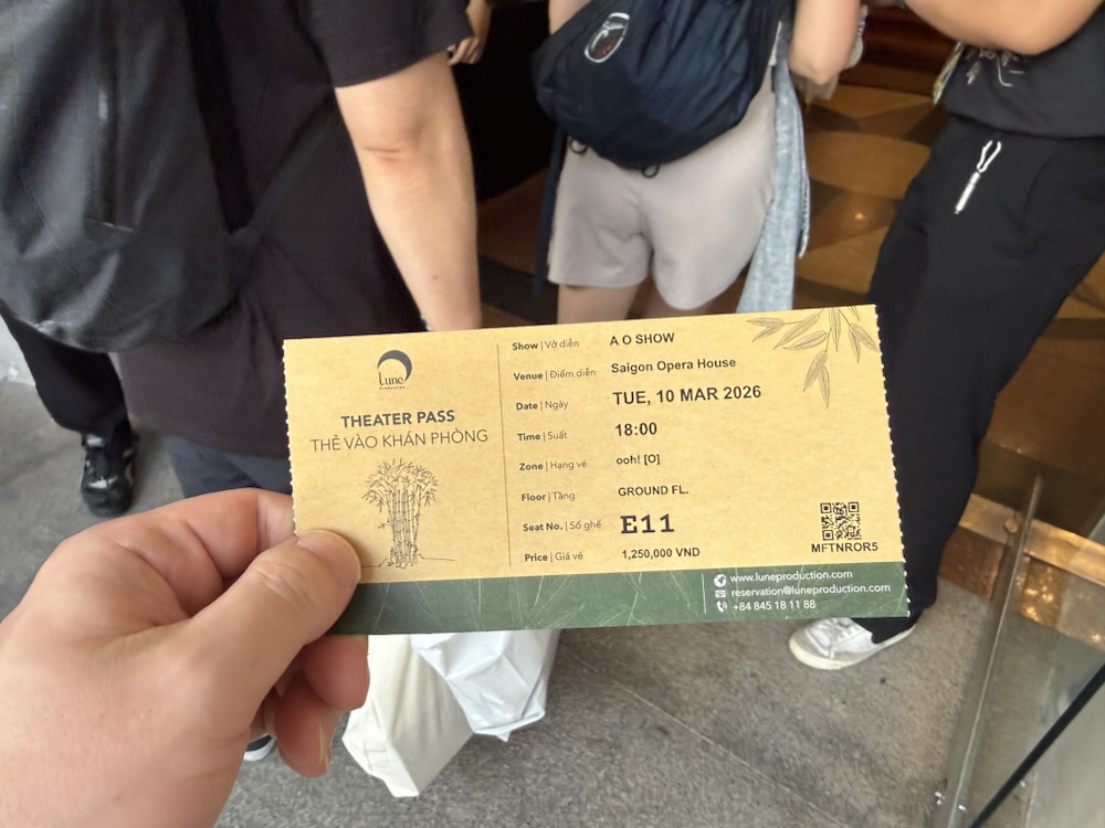 공연 시간은 18:00과 20:45 이렇게 두 타임이 있었고 나는 18:00 공연을 선택했다. 티켓은 좌석 위치에 따라 세 가지 등급으로 나뉘는데, 1층 양 끝자리인 AAH는 80만 동(약 4만 5천원), 1층 중앙인 OOH는 125만 동(약 7만 원), 2층인 Wow는 175만 동(약10만원)이다.